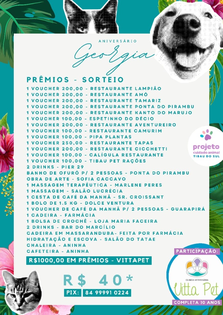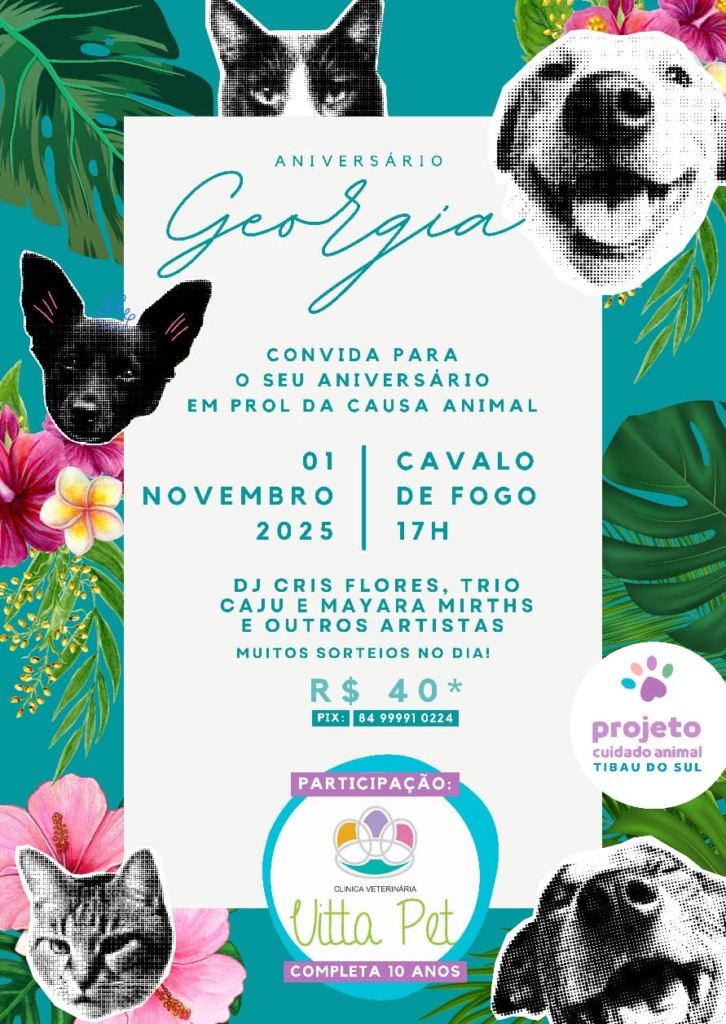 No dia 1º de novembro de 2025, a protetora Georgia Magalhães transformará a comemoração do seu aniversário em um gesto de amor e solidariedade pelos animais. O evento, que acontece a partir das 17h no Cavalo de Fogo (Tibau do Sul), reunirá amigos, apoiadores e defensores da causa animal em uma festa especial em prol do Projeto Cuidado Animal Tibau do Sul.