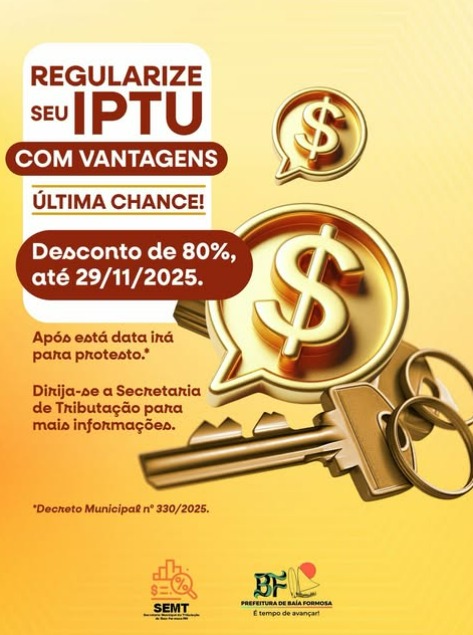 A Prefeitura de Baía Formosa, no litoral Sul potiguar, está concedendo uma última oportunidade para regularização do IPTU com condições especiais. Até o dia 29 de novembro de 2025, os contribuintes poderão obter descontos de até 80% sobre juros e multas referentes a débitos municipais.