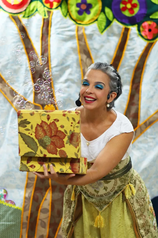 A apresentação propõe uma experiência interativa, em que o público é convidado a participar ativamente das narrativas. A atriz utiliza histórias populares para criar uma conexão direta com os espectadores, conduzindo a encenação de forma lúdica e envolvente. Entre os contos apresentados estão “Os pássaros”, “A tartaruga e a fruta amarela”, “O pote vazio” e “O país dos sonhos”, que ganham novas interpretações com o uso de músicas e brincadeiras.