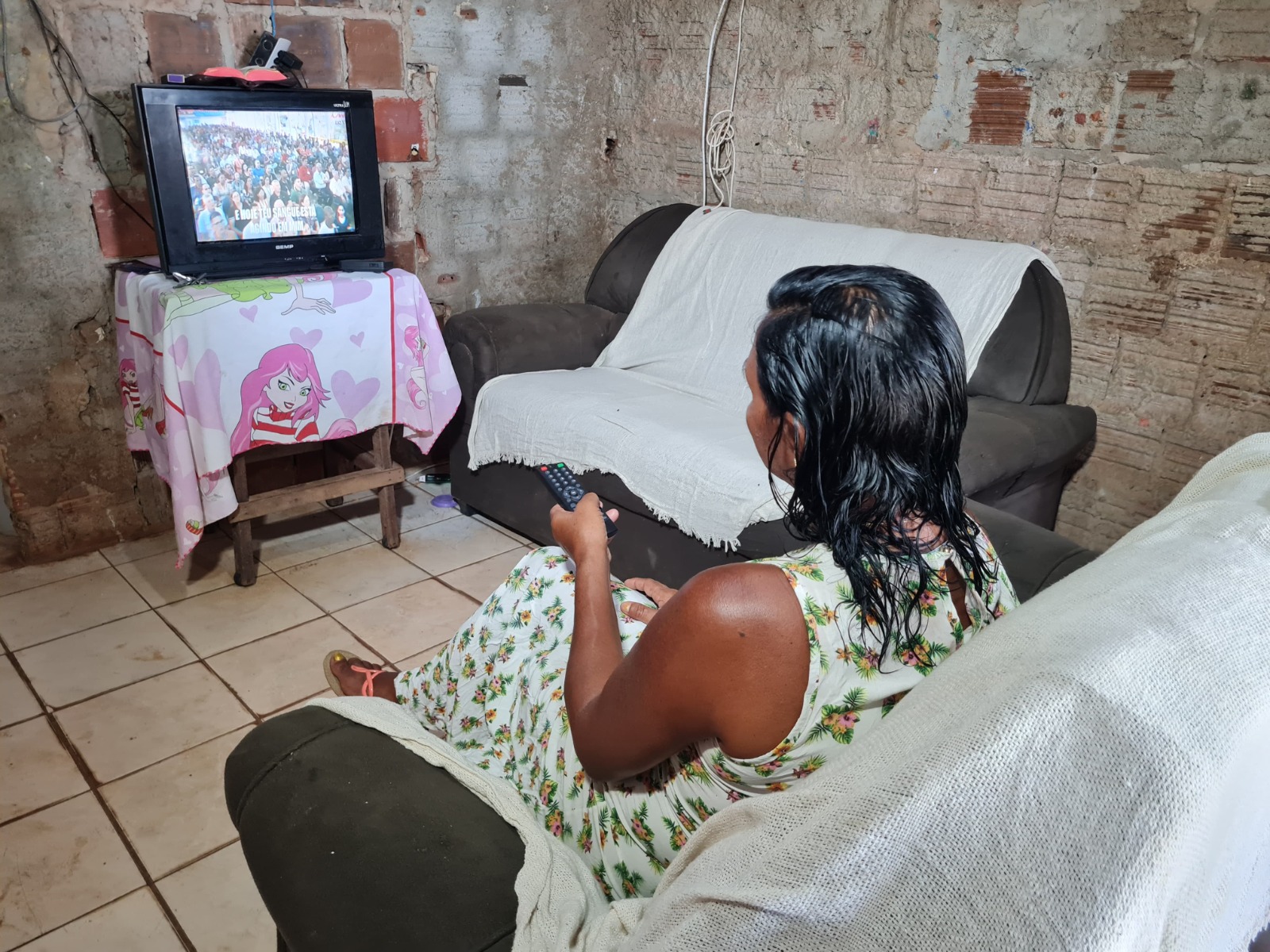 Germana Gonçalves, de 50 anos, vive sozinha em Inhumas (GO) e tem na televisão sua maior companheira. Mesmo com acesso à internet, a TV sempre ocupou um lugar especial em sua vida, como parte de sua família. “A TV é fundamental pra mim, até converso com ela. É a minha companhia”, conta Germana.