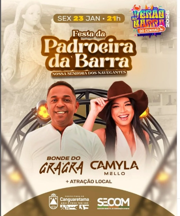 O evento contará com apresentações musicais de Bonde do Gragra, Camyla Mello e uma atração local, garantindo animação após as atividades religiosas que marcam a celebração da padroeira.
