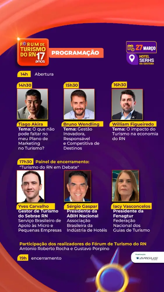 Promovido pela Argus Eventos — responsável também pela FEMPTUR – Feira dos Municípios e Produtos Turísticos do Rio Grande do Norte —, o fórum se destaca pelo ambiente de networking qualificado e pela programação voltada ao desenvolvimento do turismo regional.