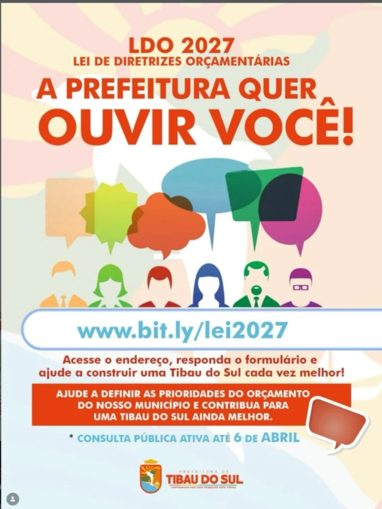 A iniciativa permite que moradores de Tibau do Sul contribuam diretamente com sugestões e indiquem prioridades para o orçamento público. Para isso, está disponível um formulário online, que pode ser acessado até o dia 6 de abril, por meio do link: www.bit.ly/lei2027.