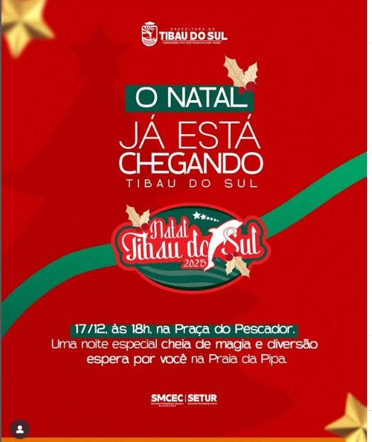 A gestão municipal convida toda a população a participar do momento, que marca o início da programação de Natal em Tibau do Sul e deve atrair grande público à região turística da Pipa.