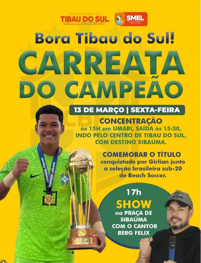 O município de Tibau do Sul prepara uma grande celebração para homenagear o atleta Girlian Souza, campeão com a Seleção Brasileira Sub‑20 de Beach Soccer.