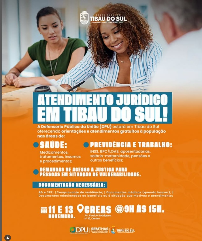 A população de Tibau do Sul contará, nos dias 11 e 13 de novembro, com atendimentos gratuitos realizados pela Defensoria Pública da União (DPU). A ação, em parceria com a Prefeitura de Tibau do Sul e a Secretaria Municipal de Trabalho, Habitação e Assistência Social, vai oferecer orientações e serviços jurídicos nas áreas de saúde, previdência, trabalho e acesso à justiça para pessoas em situação de vulnerabilidade social.