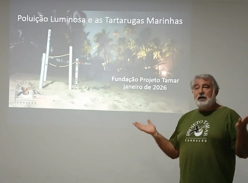 Durante o workshop, o pesquisador explicou como o excesso de luz nas praias pode desorientar filhotes, afastar fêmeas em fase de reprodução e comprometer todo o ciclo de vida da espécie, além de impactar outros organismos que dependem da escuridão natural para sobreviver.